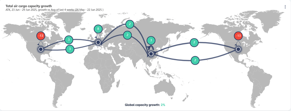 China-US Cargo Down: Air freight from Asia to North America dropped significantly (10.7%) in May. Why? New U.S. tariffs and the end of the “de minimis” rule for small Chinese packages.